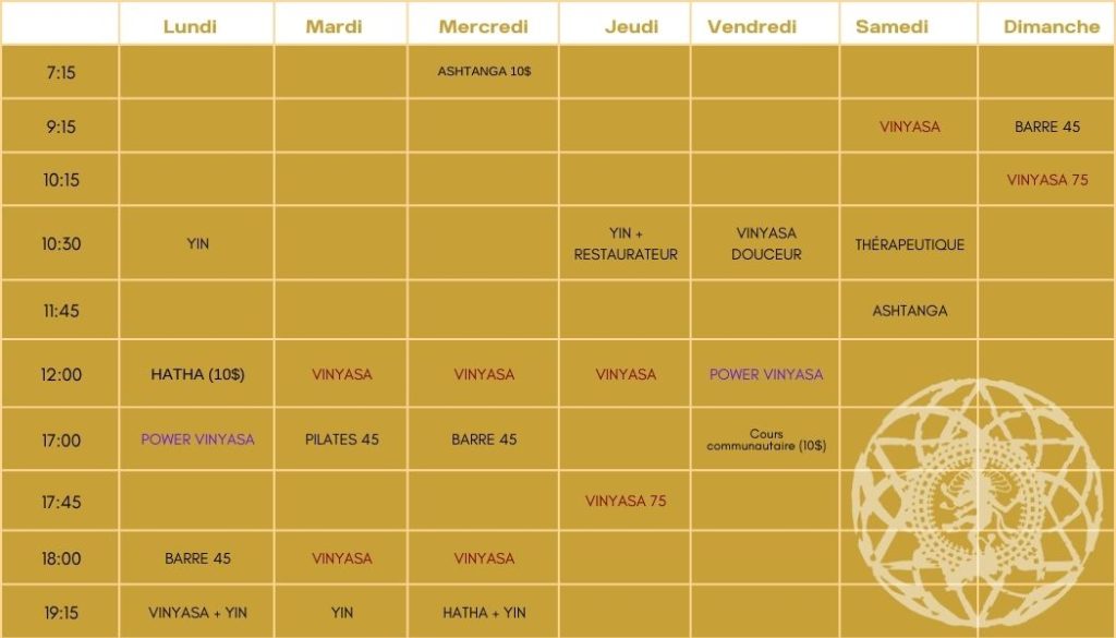 Apportez votre tapis, votre bouteille d’eau et des vêtements confortables. Si vous n’avez pas de tapis, pas de souci : nous en louons sur place pour 3 $.